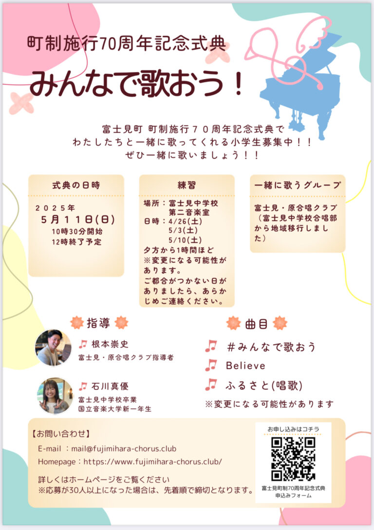 富士見町制70周年記念式典で一緒に歌いませんか?